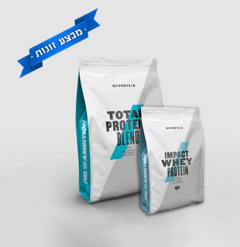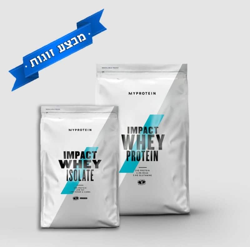 מבצע זוגות: אבקת חלבון איזולייט מי גבינה (Impact Whey Isolate) במשקל 5 ק”ג + אבקת חלבון מי גבינה מרוכז (Impact Whey Protein) במשקל 1 ק”ג.