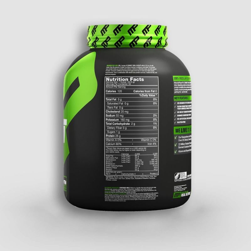 היתרון הבולט של Combat 100% Casein MusclePharm ביחס לשאר האבקות הסטנדרטיות הוא זמן הספיגה האיטי שחלבון זה נספג בגוף, ולכן ספורטאים רבים צורכים אותו