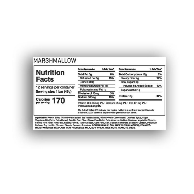 | Protein Blend (Whey Protein Isolate, Soy Protein Isolate, Whey Protein Concentrate), Dextrose Syrup, Sugar, Vegetable Oils (Palm, Palm Kernel), Soluble Corn Fiber, Gluten-Free Rolled Oats, Almonds, Vegetable Glycerin, Maltitol, Chicory Root Fiber, Rice Flour, Cocoa (Processed With Alkali), Natural Flavors, Tapioca Starch, Corn Cereal, Salt, Calcium Carbonate, Sunflower Lecithin, Potassium Sorbate, Tricalcium Phosphate, Soy Lecithin, Peanuts, Sucralose. | ||